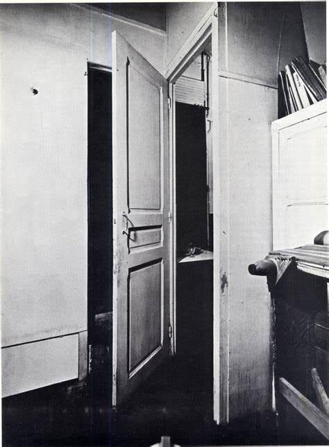 Door, 11, rue Larrey (1927), (was) ‘a single door which would close alternatively on two jamb-linings placed at right angles’ (Schwarz, 1970: 497). Since the door can be open without being closed, but never closed without being open as well, the hinge collapses around its pivot, which will soon be interrogated via an ‘ironic causality’ that hinges on the homonymy and homophony of the signifier unleashed by Duchamp’s ‘falconry (fauconnie`re)’