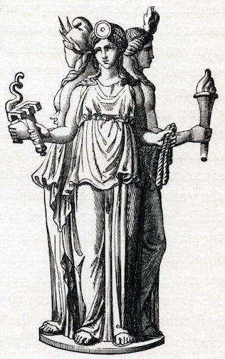 Mallarmé’s work-for-hire Les Dieux Antiques features an illustration of Hecate, a triadic muse. The triple-bodied Greek goddess of passageways, crossroads, and sorcery, Hecate was originally a chthonic deity that during the middle-Platonic era assumed a theurgic stellar aspect, acting as a bridge and transmission system for souls transitioning into the higher realms. According to Sarah Iles Johnston: