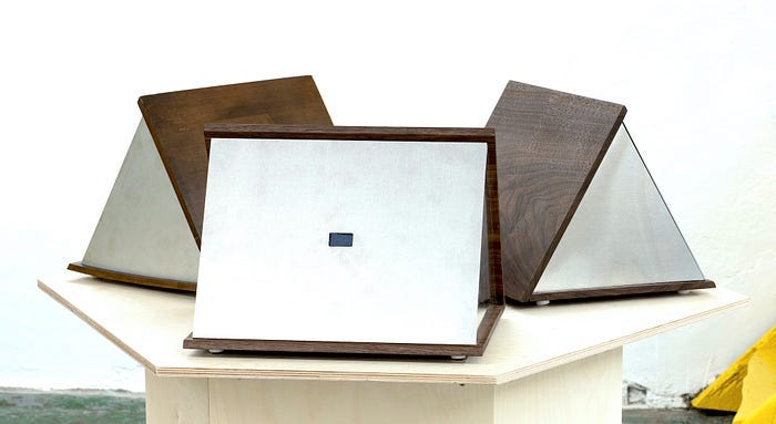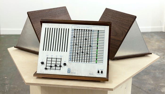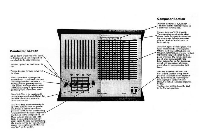 The Triadex Muse–weird commercial folly of MIT’s Martin Minsky and Ed Fredkin, two of the “fathers” of AI ²–is a notably unmusical musical device that generates endless patterns of square-wave tones. It is also an early example of cellular-automata-driven generative AI. Its pyramidic form reflects the Triadex of its name, while “Muse” suggests creative forces from beyond the self and personal volition: the machine derives its evolving musical compositions and light patterns from uncannily complex digital phenomena that emerge from the simple rules governing cellular automata.