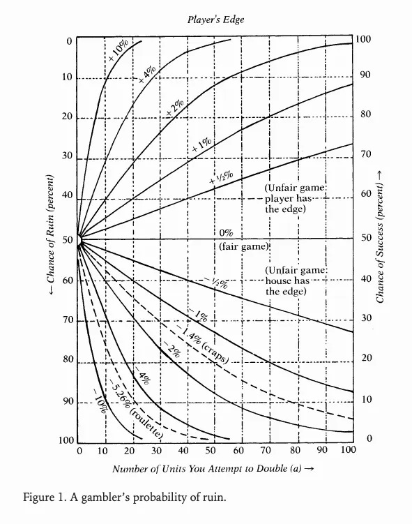 Tiny inflections in the infrathin make up the physical and mathematical structures that give player or house advantage in a game of chance. Per Thomas Bass in The Eudaemonic Pie (above), craps offers the player the least disadvantage, -1.4%, while roulette, the game that Thomas and his fellow Eudaemons “beat” using computers hidden in their shoes, sits at -5.4%.