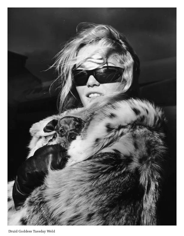“Druid Goddess Tuesday Weld” reads the description in the photo insert of Secret and Suppressed II (Feral House, 2008). Child-star-turned-Hollywood-star Weld, star of Lord Love a Duck, Pretty Poison, and Play it as it Lays, rumored lover of Elvis and Mick Jagger, confirmed lover of Al Pacino, Omar Sharif, and Mikhal Baryshnakov, long a focus of obsessional nuts and conspiracy theories, some of whom apparently believed her to be steeped in the Celtic Mysteries that W.B. Yeats had tried to codify a century earlier.