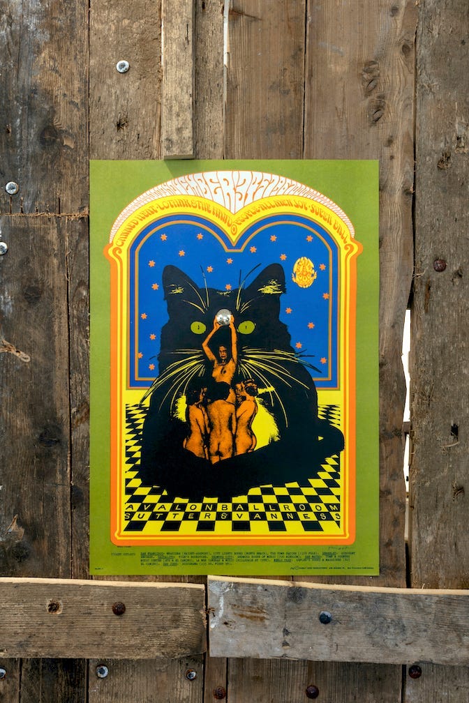 An original 1967 psychedelic poster for Canned Heat, Lothar and the Hand People, and Allmen Joy at the Avalon Ballroom designed by Robert Fried for the telephone poles or walls of the Haight, is papered onto a replica of the door from Étant donnés, its peephole opening onto the show. Viewed from the proper angle, a disco ball hanging in the space fills the peephole, held aloft by a group of skyclad women in the embrace of an outsize black cat. A Mosiac pavement, stars in a blue sky beneath a double arch, symbolic remnants of the Caesarea Maritima Mithraeum, as Shadow casters work in the infra-thin.