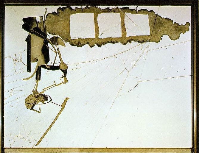 “Shadow casters work in the infra-thin” Duchamp noted in The Green Box, referring to the figure — a higher-dimensional“imaginary entity” — dominating the top panel of The Large Glass. All shattered parts, imperceptible connective tissue, phantom limbs, The Pendu Femelle resembles a termite queen mated with a broken kite…