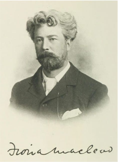 William Sharp was of mixed Swedish-Scottish ancestry…He eventually became so obsessed with Celtic fantasies that he developed an alternate personality, Fiona Macleod, who provided him with a Jacobite ancestor and personality, even more bizarre than Mathers’s Comte de Glenstrae. Sharp was familiar with the role of the eighteenth-century Macleods in the Jacobite rebellion of 1745 and of the Macleods’ long ties with Sweden. In her spirit-dictations, the fantasy Fiona hinted to Sharp that he descended from or reincarnated her Jacobite father, which provoked Yeats and Mathers to pester Sharp for detailed descriptions of the Highland garb and Macleod-Mackenzie tartan worn by Fiona’s father…Yeats believed that Fiona was a Swedenborgian “astral body” and he later praised Sharp-Macleod as a man “through whom the fluidic world seemed to flow.” In the 1890s, he worked with Sharp to develop a special “Masonic Rite,” which received inspiration from a vision experienced by “Fiona.”